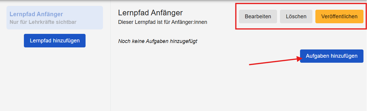 Der Lernpfad ist erstellt, jetzt können Sie Bildungsressourcen und Materialien hinzufügen. Sie können den Pfad auch bearbeiten, löschen und veröffentlichen. Das Veröffentlichen des Pfades bedeutet, ihn an die Lernenden zu senden.
