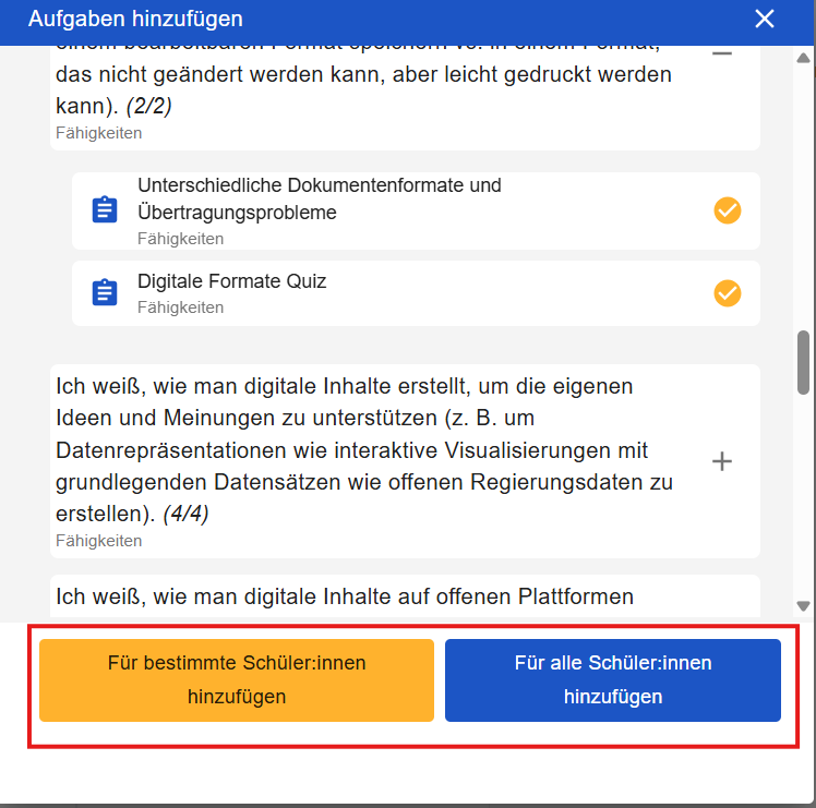 Aufgaben können aus dem digitalen Kompetenzraster hinzugefügt werden. Die ausgewählten Materialien werden entweder allen Lernenden oder nur einer bestimmten Gruppe zugeteilt, die Sie für diesen Lernpfad auswählen. Ist der Lernpfad veröffentlicht, wird er nur für ausgewählte Lernende zugänglich.