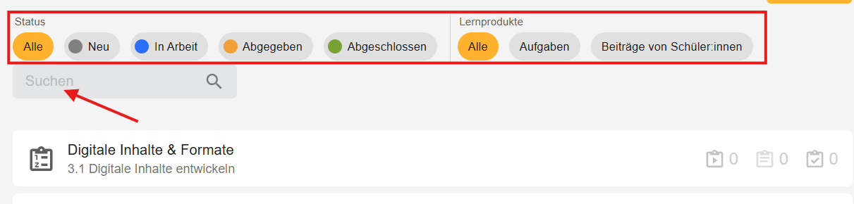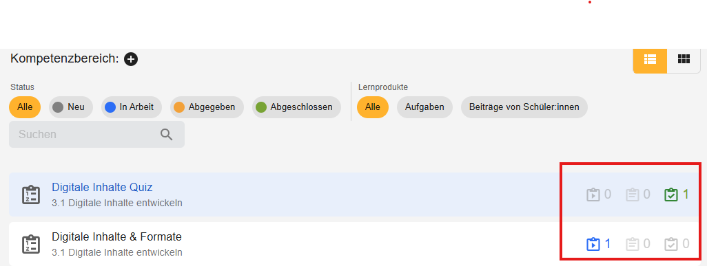 Im Tab “Aufgaben” sind alle Lernmaterialien aus dem gewählten Kurs aufgelistet. Die Lehrpersonen können die Aufgaben nach Status und nach der Art der Lernprodukte filtern oder spezifisch suchen.