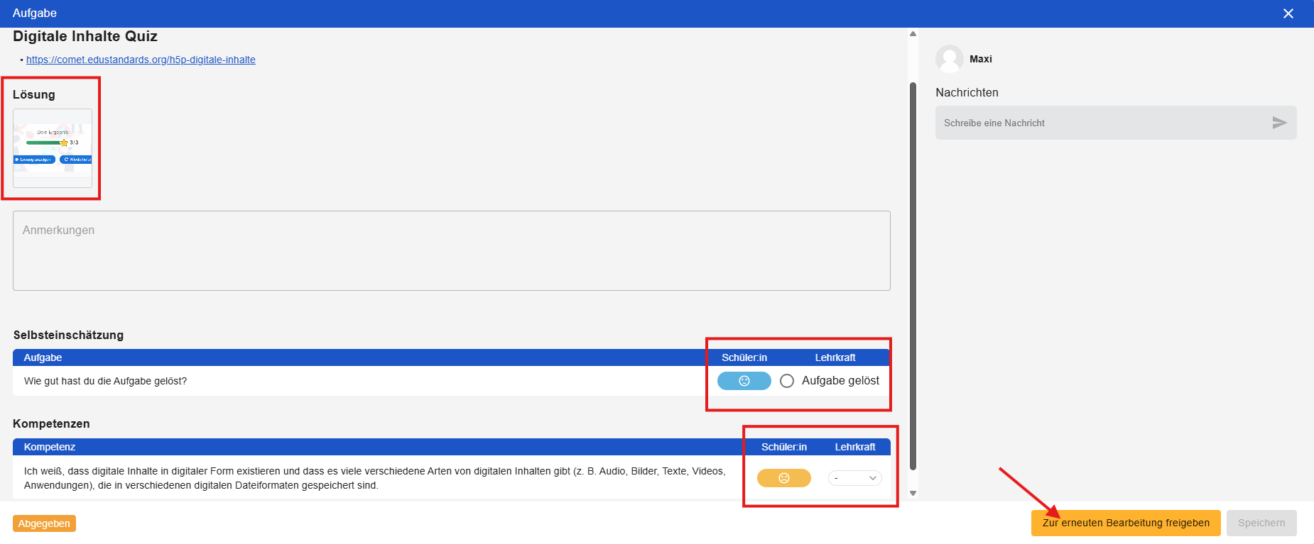 In der Einzelansicht eines Lernenden ist auf einen Blick ersichtlich, welche Aufgaben in Bearbeitung sind und welche bereits abgeschlossen wurden. Durch Anklicken einer Aufgabe erhalten Sie Einsicht in die abgegebene Lösung (sofern vorhanden), Anmerkungen der Lernenden, ihre Selbsteinschätzung zur Aufgabe sowie zur zugeordneten Kompetenz. Zudem besteht die Möglichkeit, direkt Nachrichten zu senden. Lehrpersonen können die Ergebnisse der Lernenden ebenfalls einschätzen, indem sie die Felder neben den Selbsteinschätzungen ausfüllen. Auf diese Weise lässt sich eine Aufgabe als erledigt markieren und die zugehörige Kompetenz bewerten. Der Chat kann als Möglichkeit genutzt werden, direkt Feedback zu geben oder Fragen zu beantworten, die von den Lernenden in den Anmerkungen geschrieben werden.