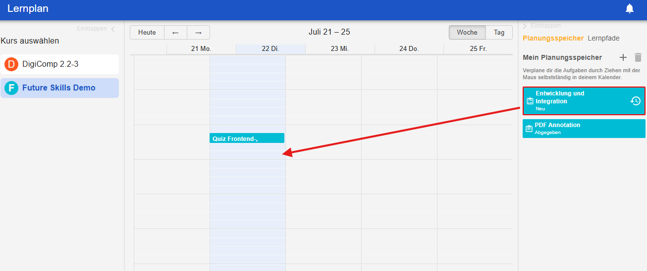 Im Tab „Lernplan“ sehen die Lernenden ihren persönlichen Wochenplan sowie den Planungsspeicher, in dem alle von Lehrpersonen zugewiesenen Aufgaben und Materialien gesammelt werden. Per Drag-and-drop lassen sich diese flexibel in den Kalender einfügen, um einen individuellen Wochenplan zu erstellen. Die Lernenden wählen selbst, wann sie welche Aufgabe bearbeiten und können die geschätzte Bearbeitungsdauer anpassen. Zusätzlich besteht die Möglichkeit, in verschiedenen Kursen und digitalen Kompetenzrastern zu stöbern und eigenständig Materialien und Aufgaben hinzuzufügen.