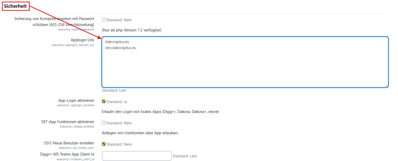 Navigieren Sie in Moodle zur „Website-Administration" -> „Plugins" -> “Plugin Übersicht” ->„ExaComp" -> Einstellungen ->Sicherheit. Unter „Applogins URLs" fügen Sie „dakoraplus.eu“ und “dev.dakoraplus.eu” hinzu.