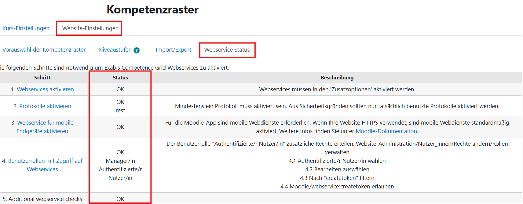 Öffnen Sie in einem Moodle-Kurs den Exabis Kompetenzraster-Block und wählen Sie „Website-Einstellungen" -> „Web Service Status“. Alle Dienste müssen als „OK“ angezeigt werden.