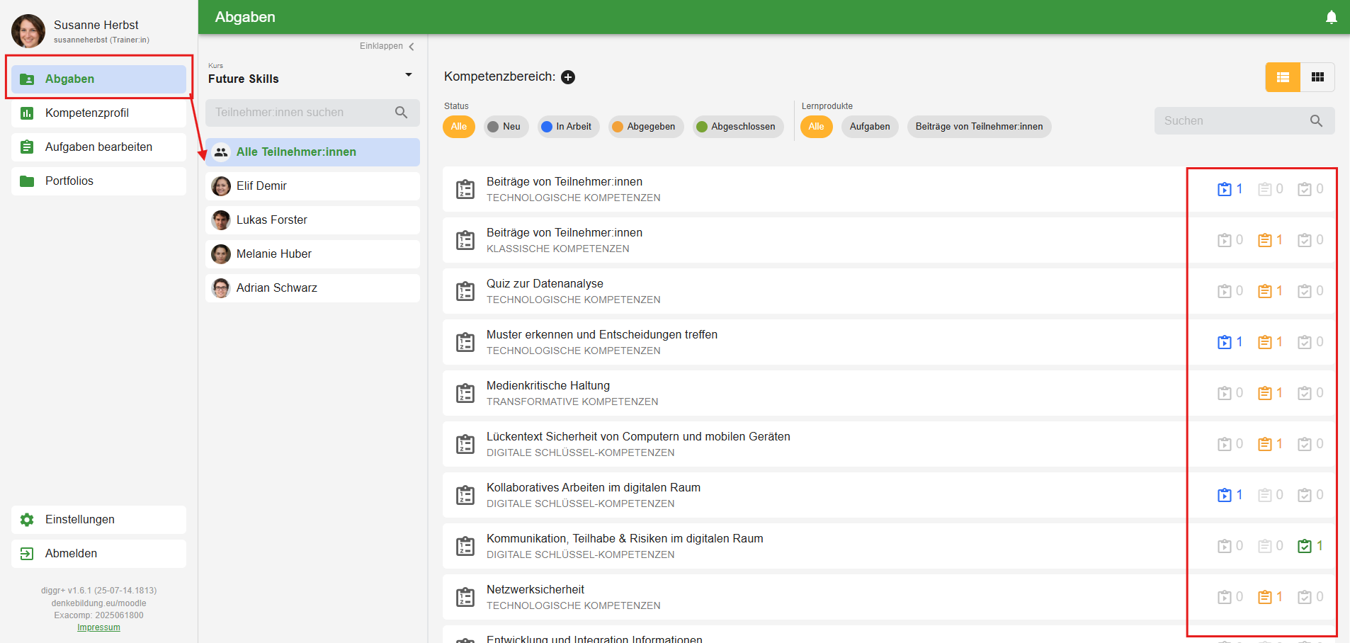 Im Tab “Abgaben” finden Lehrpersonen die Übersicht aller Aufgaben von entweder allen Teilnehmer:innen des Kurses oder einzelnen Lernenden. Die Symbole rechts neben den Aufgaben zeigen an, ob diese gerade in Bearbeitung, Abgegeben oder bereits abgeschlossen sind.