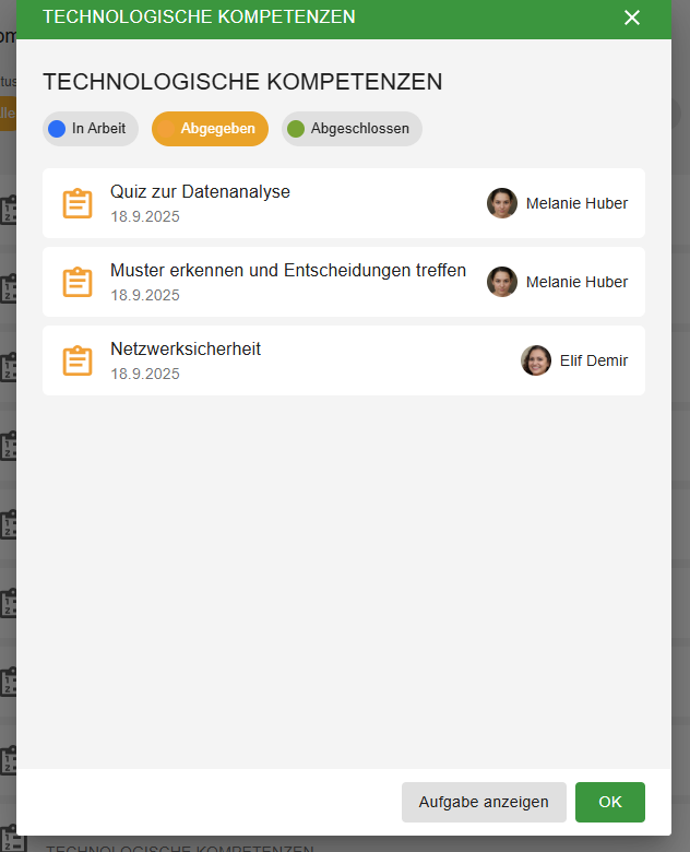 Klicken Sie auf eine Aufgabe, die abgegeben wurde (gelb markiert) erscheint ein Pop-Up-Fenster mit den Personen, die sie eingereicht haben. Klicken Sie auf eine Person, um deren Abgabe einzusehen.