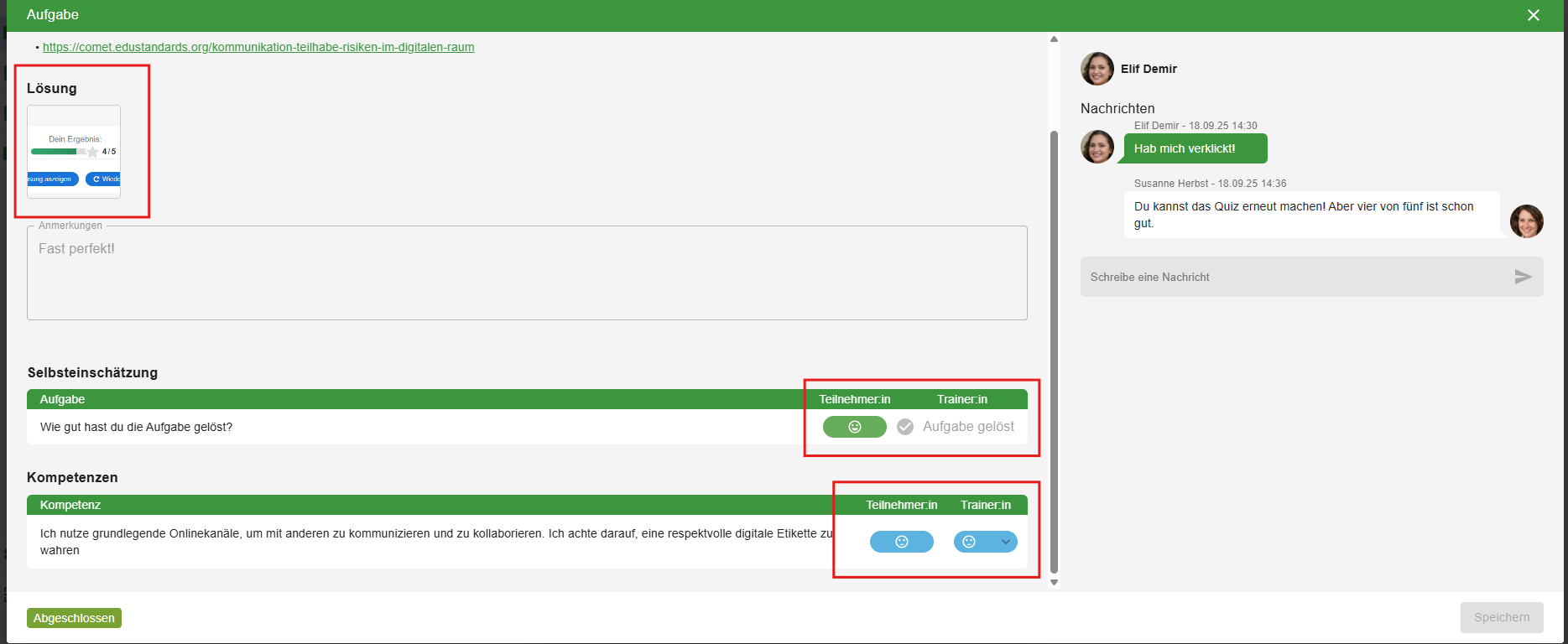 Hier sehen Sie die Lösung, Anmerkungen und Nachrichten, die abgegeben wurden. Zusätzlich zur Selbsteinschätzung der Lernenden können Sie die Aufgabe als gelöst markieren oder sie erneut zur Bearbeitung freigeben und auch die Kompetenz-Erfüllung einschätzen.