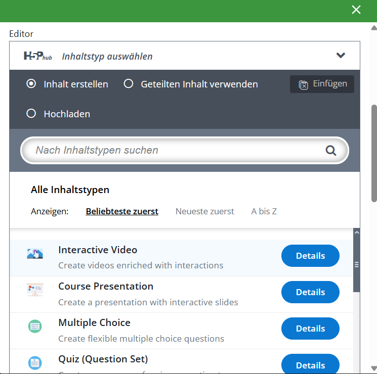 Gleich zu Beginn kann eine Beschreibung zur Aufgabe hinzugefügt werden. Darunter befinden sich die Aufgabentypen des H5P-Tools, welche unter anderem interaktive Videos, diverse Spiele und Quizzes umfassen. Durch Klicken des Buttons “Details” werden die einzelnen Aufgabentypen näher beschrieben.