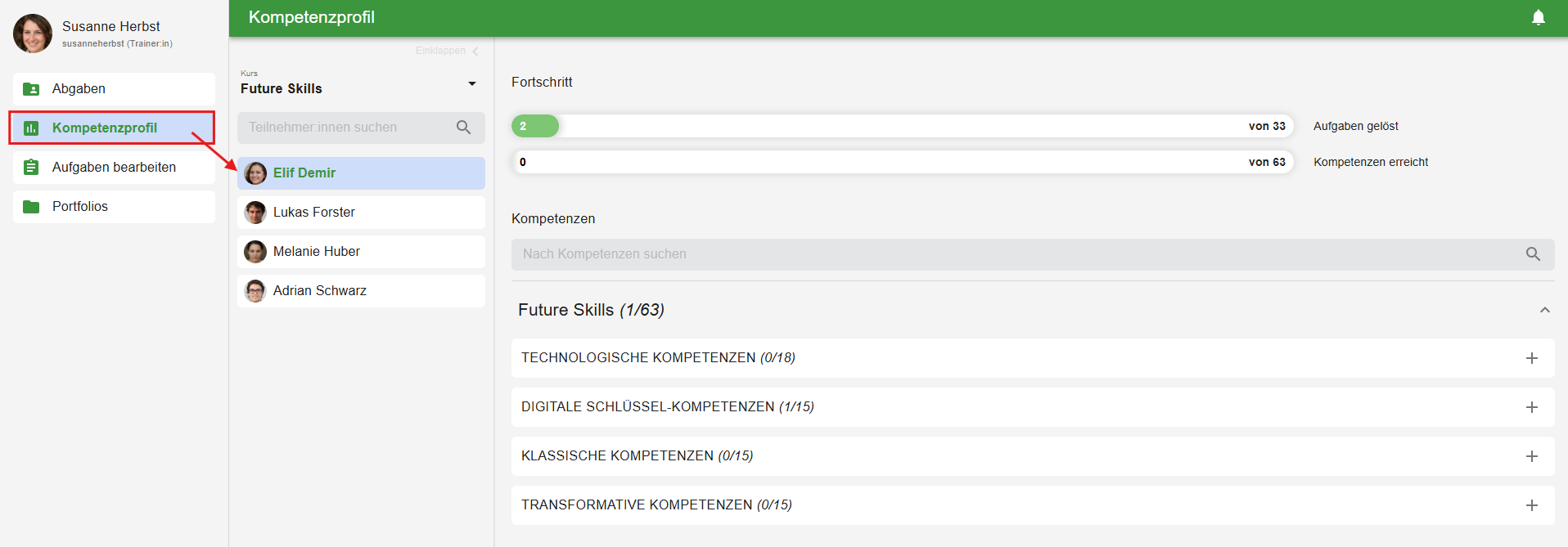 Im Tab „Kompetenzprofil“ erhalten Lehrpersonen einen strukturierten Überblick über den Lernfortschritt ihrer Schüler:innen. Es wird sichtbar, welche Aufgaben bereits bearbeitet wurden und welche Kompetenzen dadurch erreicht wurden.