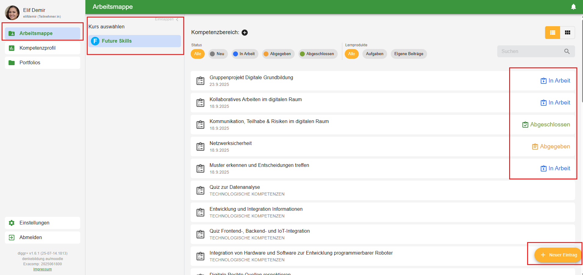 Sobald ein Kurs ausgewählt wurde, werden sämtliche Aufgaben angezeigt, die für Sie freigeschaltet sind. Zusätzlich sehen Sie den jeweiligen Bearbeitungsstatus der Aufgaben – unterschieden wird zwischen „In Arbeit“, „Abgegeben“ und „Abgeschlossen“.