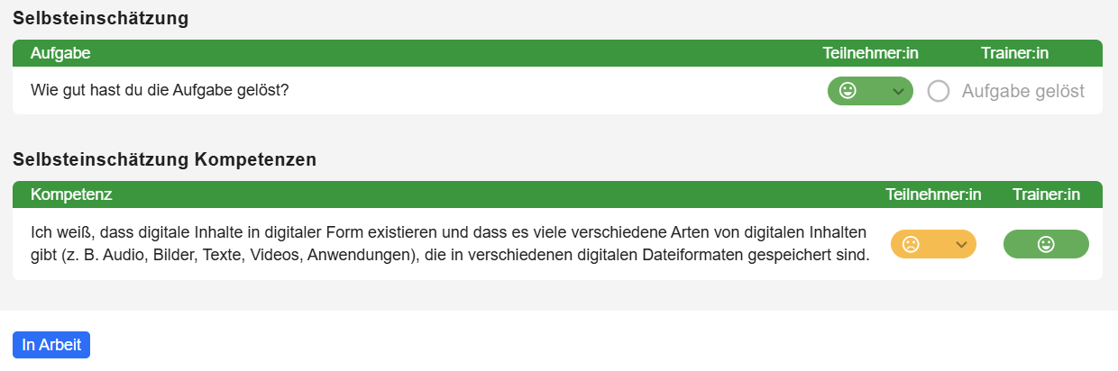 Im unteren Bereich des Fensters finden Sie zwei Felder zur Selbsteinschätzung: eines bezieht sich auf die Aufgabe selbst, das andere auf die zugrunde liegende Kompetenz. Sowohl Sie, als auch Ihre Lehrperson können hier eine Einschätzung abgeben.