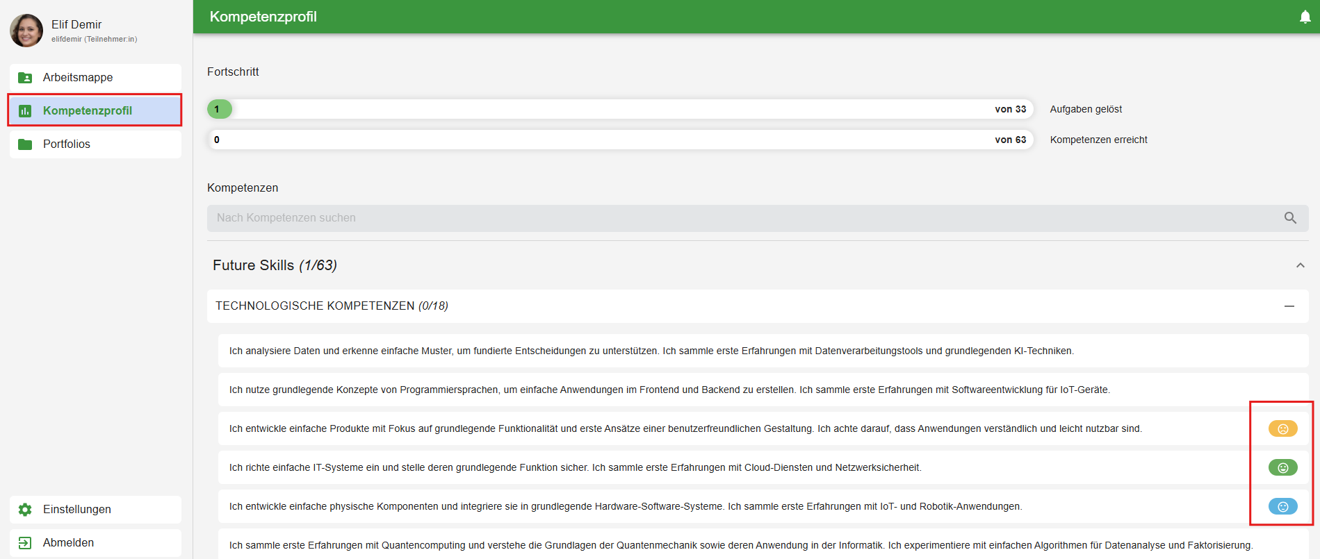 Im Kompetenzprofil erhalten Lernende einen übersichtlichen Einblick in ihren Lernfortschritt. Es wird sichtbar, wie viele Aufgaben bereits bearbeitet wurden und wie viele der im jeweiligen Kompetenzraster definierten Kompetenzen bereits erreicht sind.