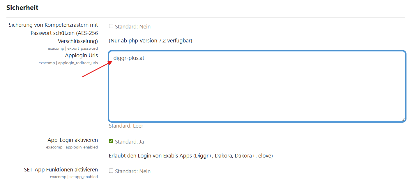 Navigieren Sie in Moodle zur „Website-Administration" -> „Plugins" -> “Plugin Übersicht” ->„ExaComp" -> Einstellungen ->Sicherheit. Unter „Applogins URLs" fügen Sie „diggr-plus.eu“ hinzu.