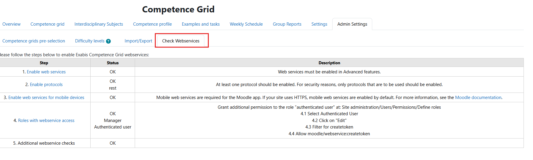 Open the Exabis Competence Grid block in a Moodle course and select “Website Settings” -> “Web Service Status.” All services must be displayed as “OK.”