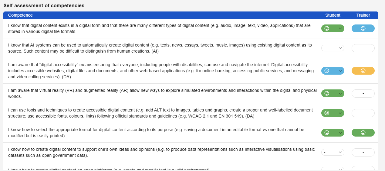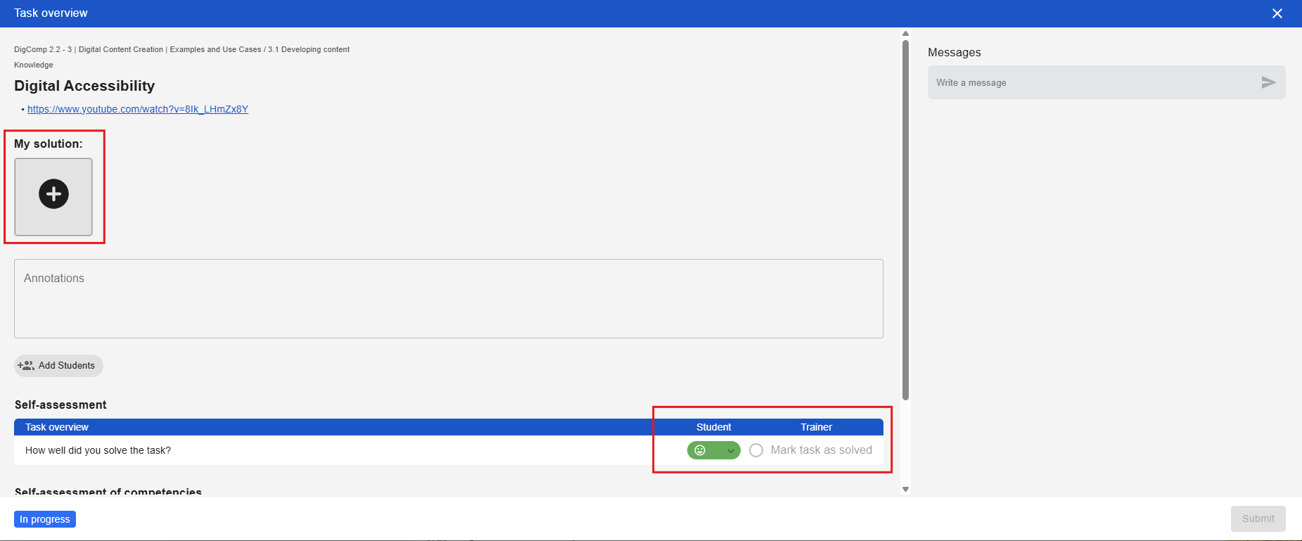 Learners conduct a self-assessment as they would for regular assignments and evaluate all competencies relevant to the assignment. Only those competencies that learners assess are released to teachers for evaluation. After submission, the free assignment appears as normal.