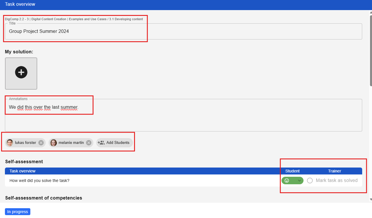 The main topics of the competency grid then appear, and one must be selected by clicking on it. A pop-up appears in which learners can add a title, description, and other group members to their task. This entry will then also appear for the added group members.