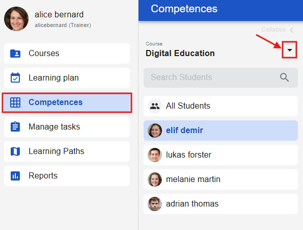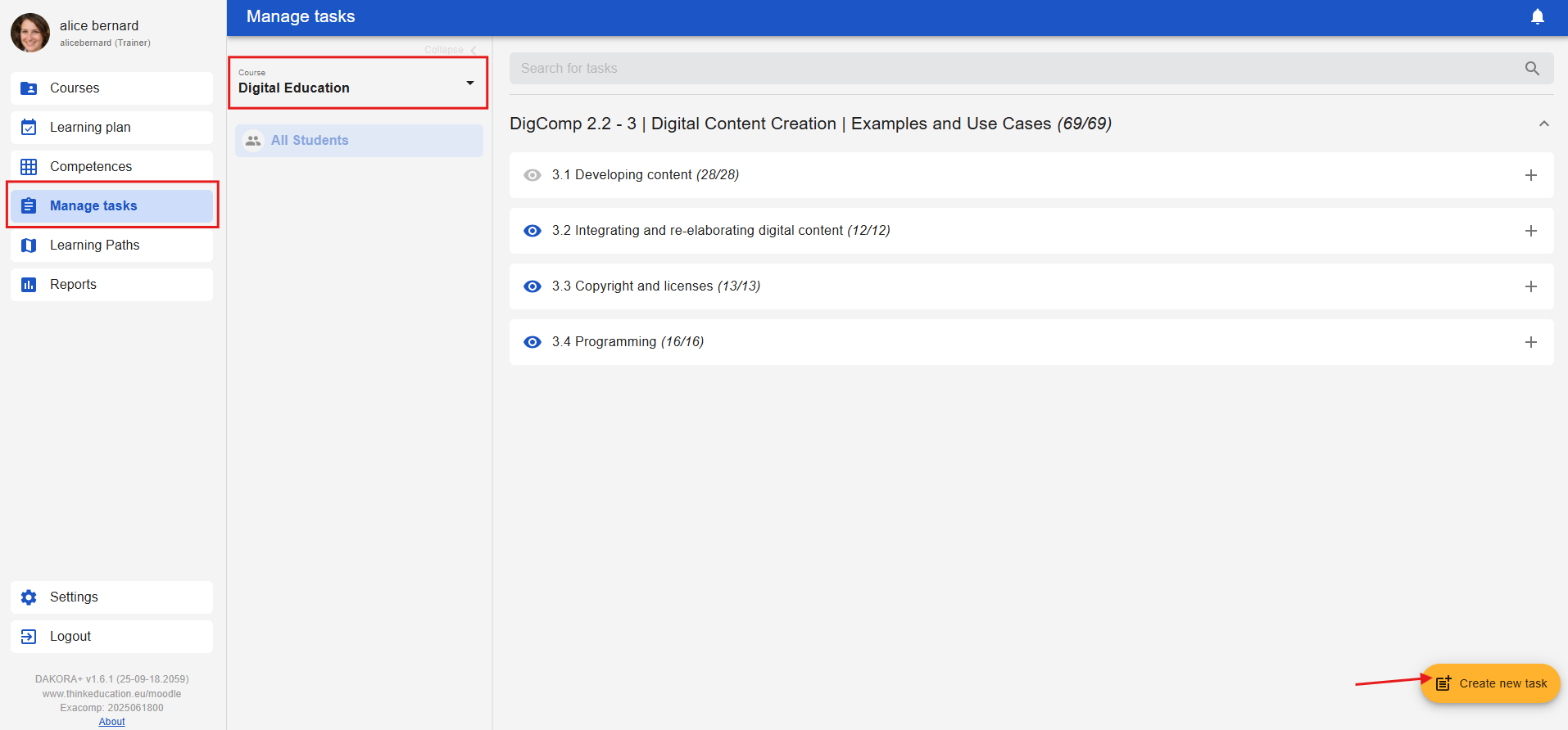 Under the “Manage tasks” tab, you can select a course and view the competencies, sub-competencies, and existing tasks. You can delete tasks by clicking on the trash can icon to the right of the tasks. There is also a button in the lower right corner for creating new tasks.