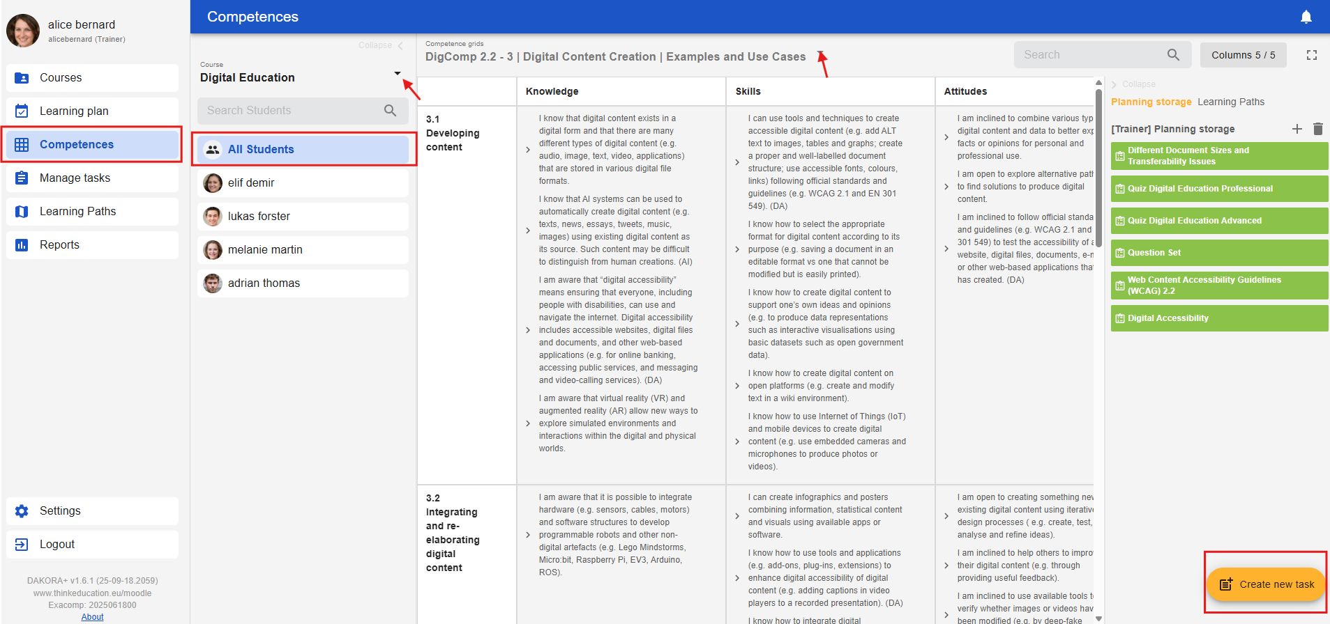 Open the “Competency Grid” tab and select the appropriate course and the desired competency grid from the drop-down menu. You will see the individual participants and the “All Students” tab; select the latter. The quickest way to add new material is to click the “Create New Task” button in the lower right corner.