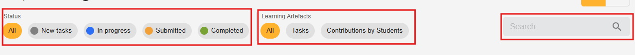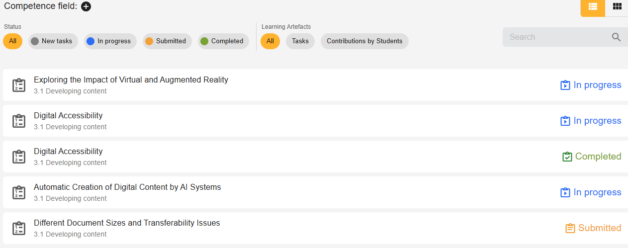 The “Tasks” tab lists all learning materials from the selected course. Teachers can filter tasks by status and type of learning product or search for specific tasks.