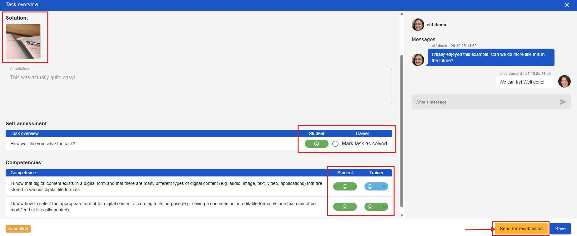 In the individual view of a learner, you can see at a glance which tasks are in progress and which have already been completed. By clicking on a task, you can view the submitted solution (if available), the learner's comments, their self-assessment of the task, and the assigned competency. It is also possible to send messages directly. Teachers can also assess the learners' results by filling in the fields next to the self-assessments. In this way, a task can be marked as completed and the associated competency can be evaluated. The chat can be used as a way to give direct feedback or answer questions written by learners in the comments.