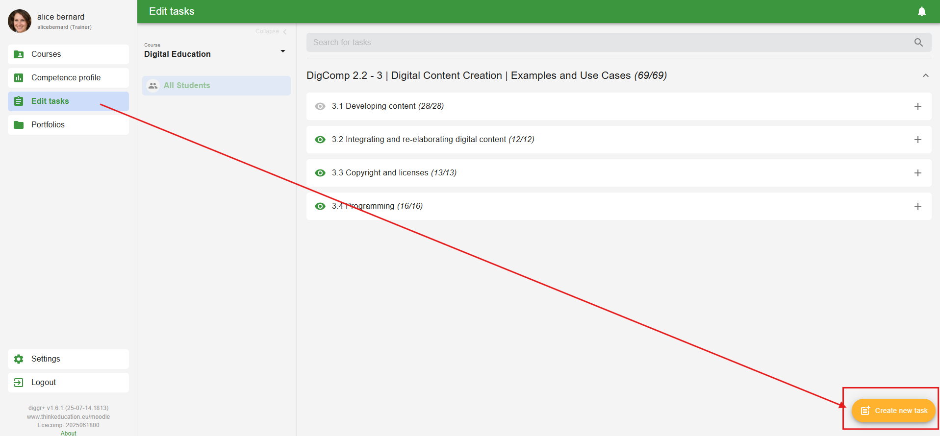 In the “Edit tasks” tab, teachers can see an overview of all tasks assigned in the competency grid, including a search function. New tasks can be created using the yellow “Create task” button.