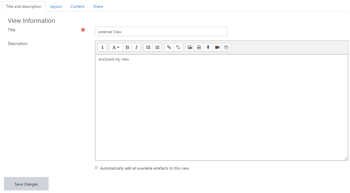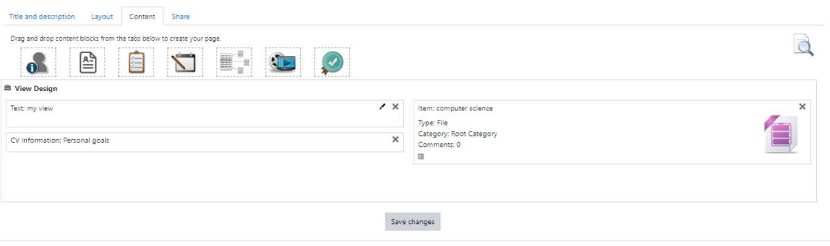 Views allow the publication of different artifacts that can be published to any target group. If a new view is created, it can be shared immediately with all course instructors. Drag & Drop allows you to add entries to the view from the list of previously created artifacts. Additional fields can be added.