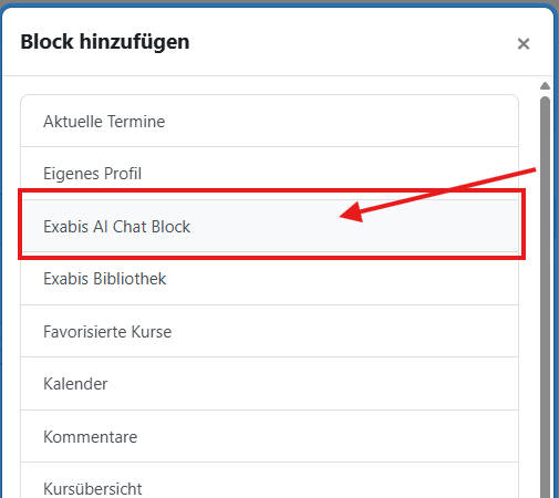 Im nächsten Schritt wählen Sie “Exabis KI Chat Block” aus.