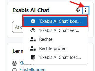 Ab diesem Zeitpunkt erscheint in Ihrem Blockfeld der Exabis KI Chat-Block, mit einem Textfeld, der Möglichkeit, Ihre gewünschte KI auszuwählen und in der oberen rechten Ecke des Blocks drei Punkte für Konfigurationsmöglichkeiten.
